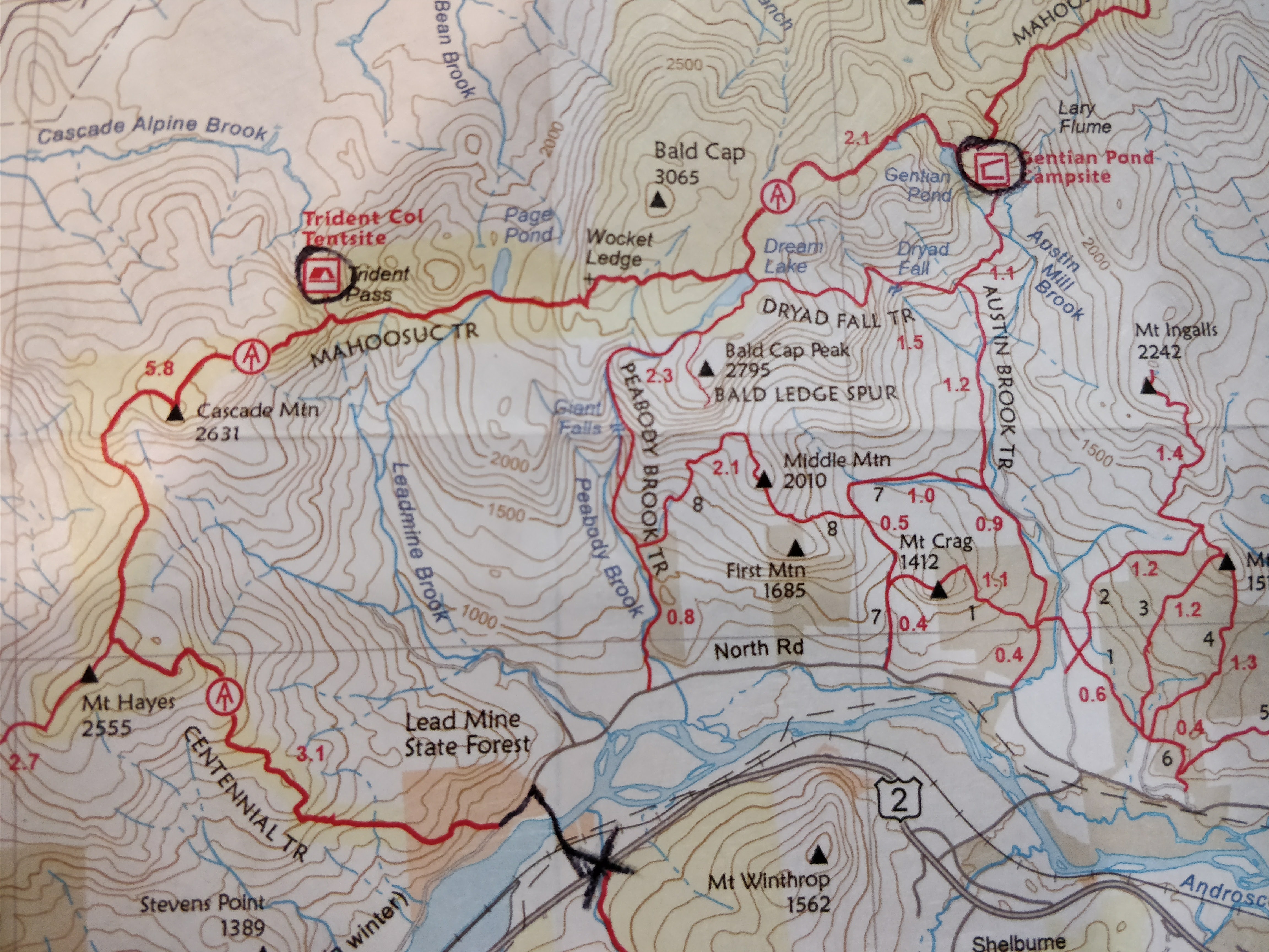 We started the hike at the Rattle River Trailhead parking lot. And we wanted to end at the Gentian Pond Shelter.